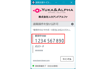 しばらくお待ちいただくと「遠隔支援サービス」が起動しますので『使用中のID』の数字をサポート担当へお伝えください。
